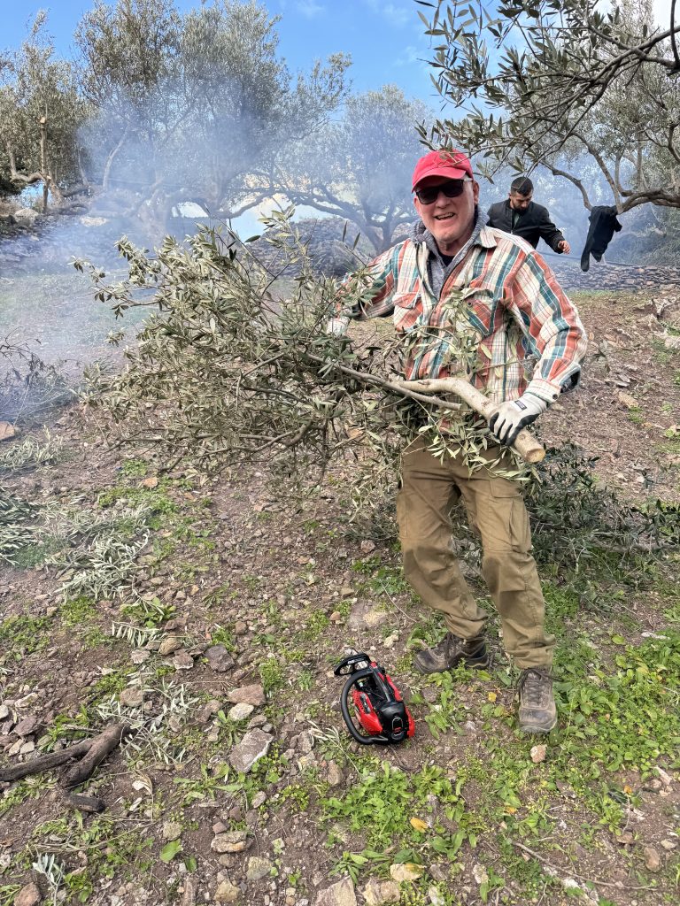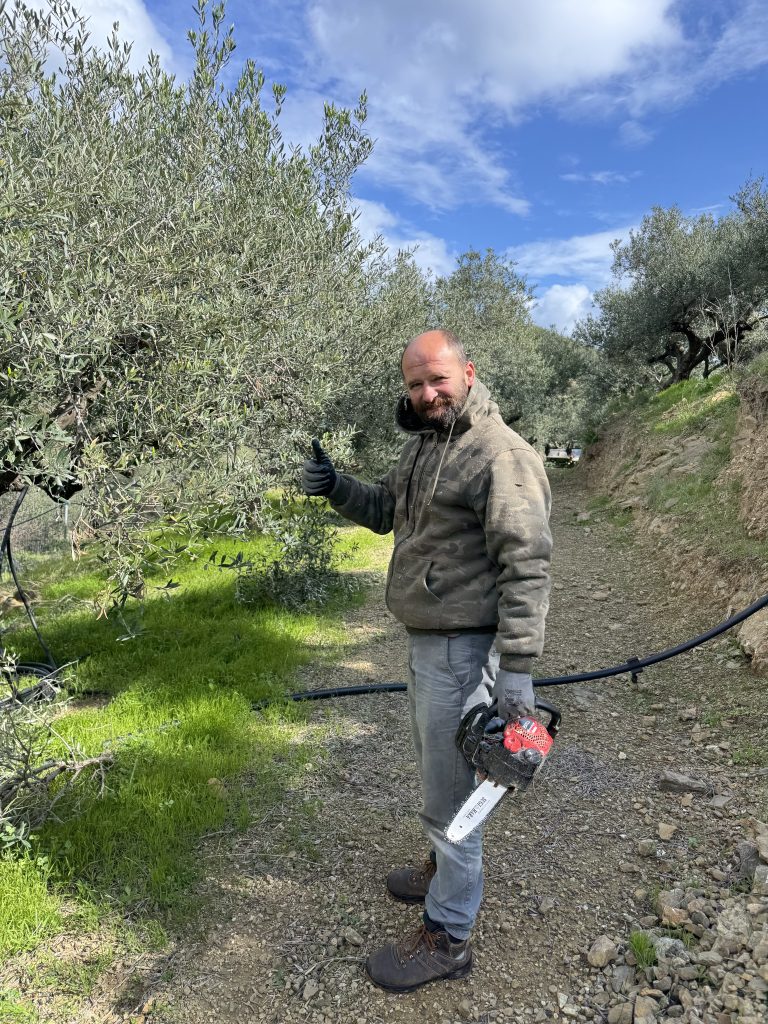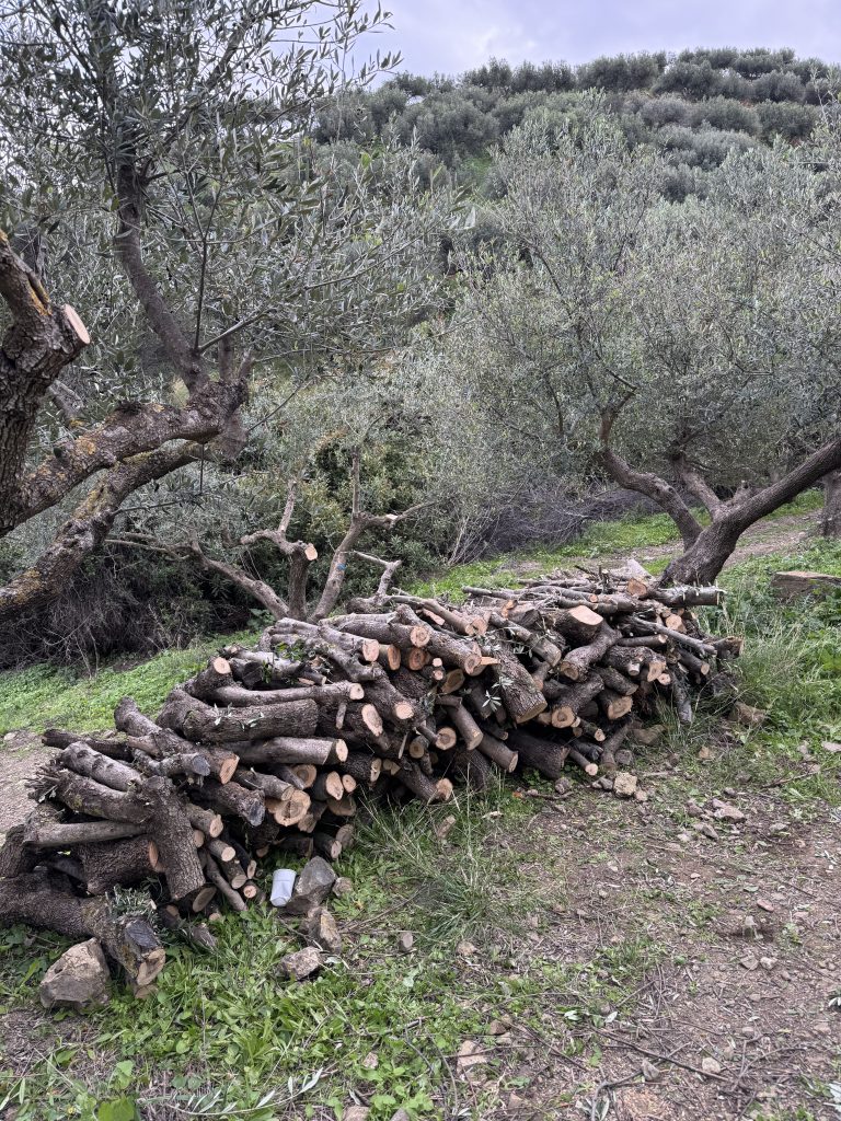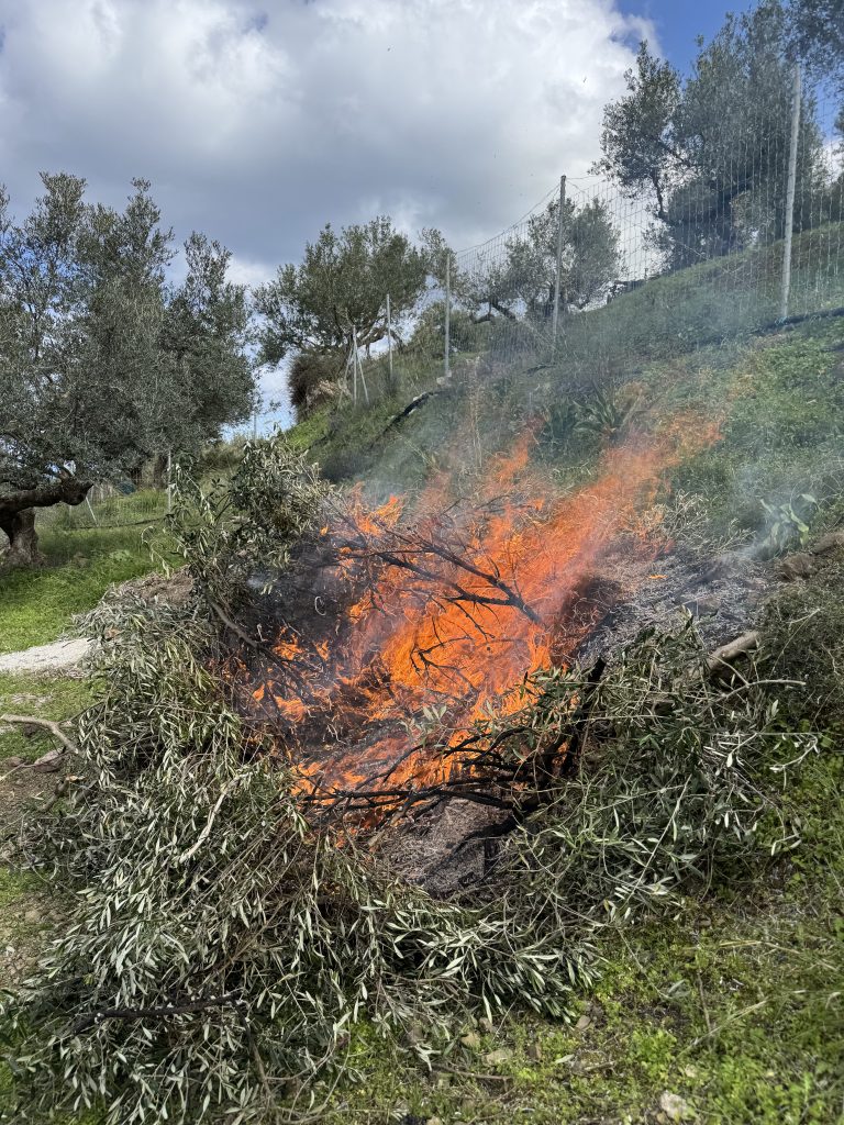 Dag 2 avslutade vi arbetet med att beskära olivträden. Alla olivträden har blivit ansade i kronan alternativt rejält beskurna. Framförallt träden i den nya olivlunden fick en kärleksfull och behövlig ansiktslyftning. På grund av förra veckans förseningar som orsakades av väderförhållandena har vi i år valt att bränna allt lövverk som beskurits från träden. Varken naturen, klockan eller nöden har någon lag. De grövre grenarna tas som vanligt om hand så vi har bränne till öppna spisen.