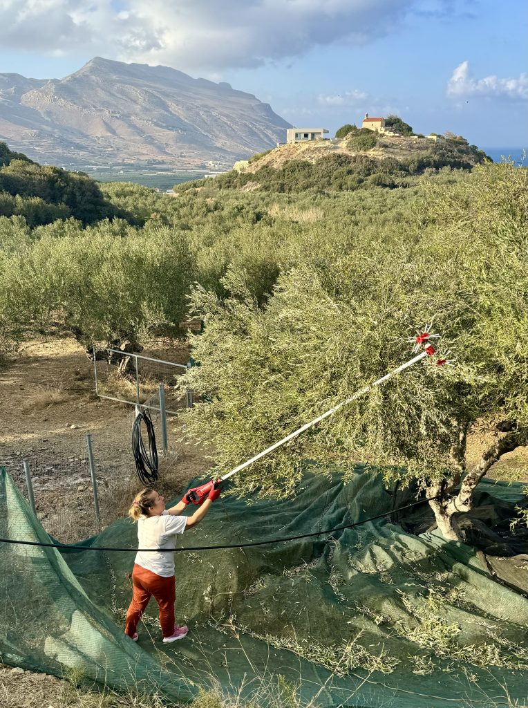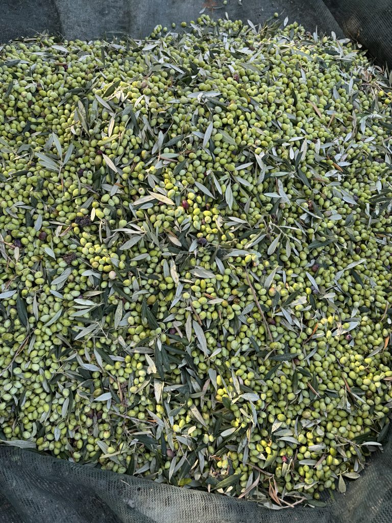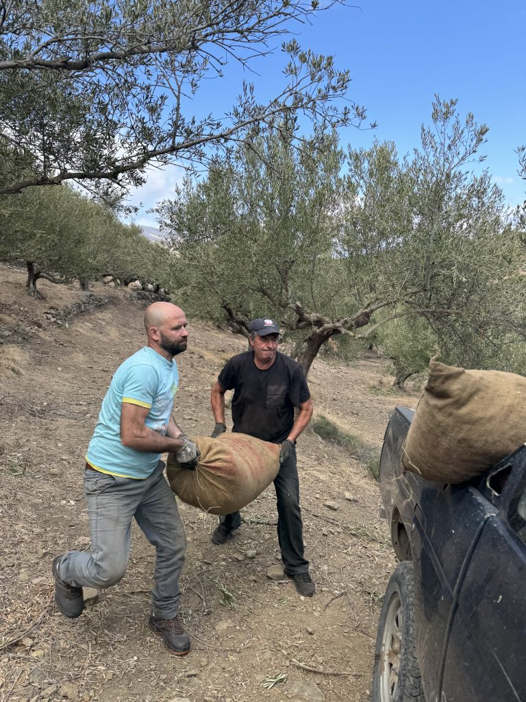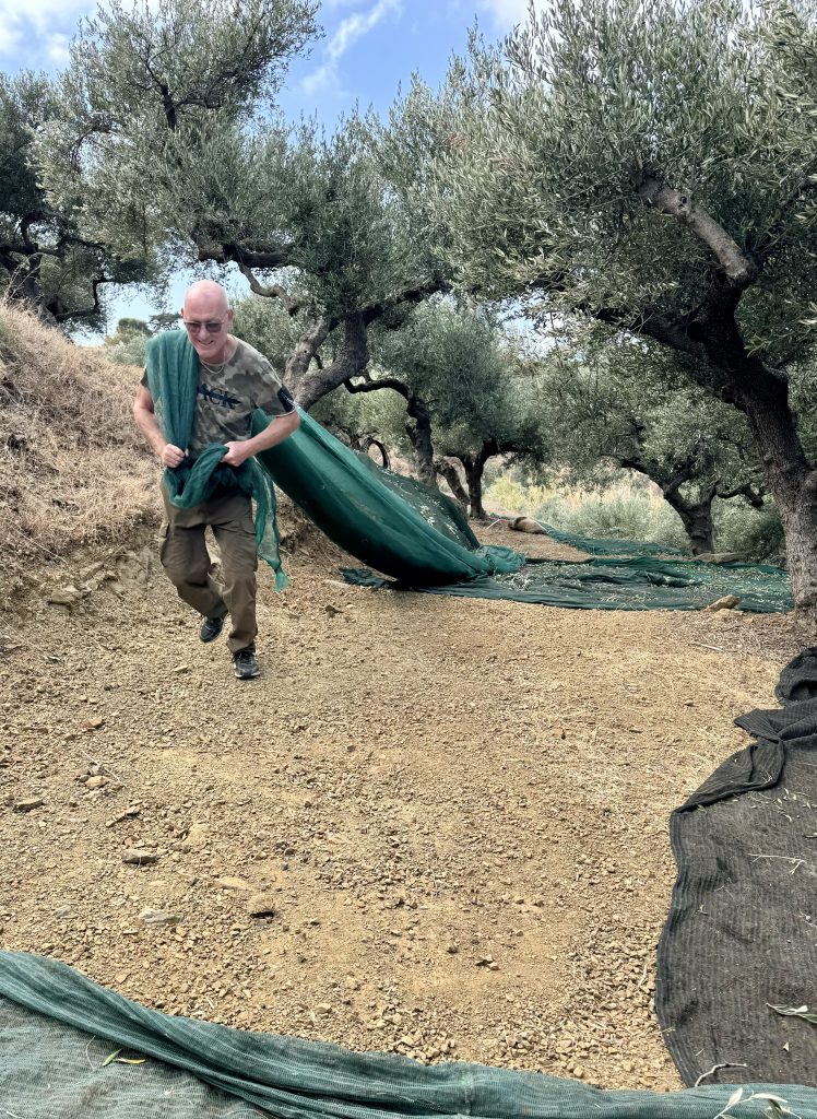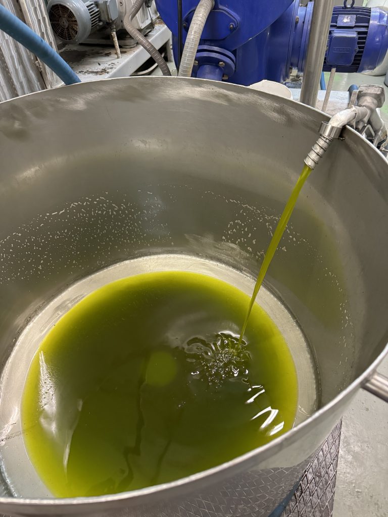 Efter avslutat dagsverke pressas dagens skörd till olivolja. Oliverna som tidigare på dagen har lämnat träden och smattrat ned på de utsträckta näten ligger nu och mals till en härligt doftande pestoröra innan den går vidare till centrifugen som pressar fram den tjocka gröna olivoljan som rinner ut och samlas i ett stort kärl innan det tappas på dunkar för att sedan transporteras upp till Sverige.